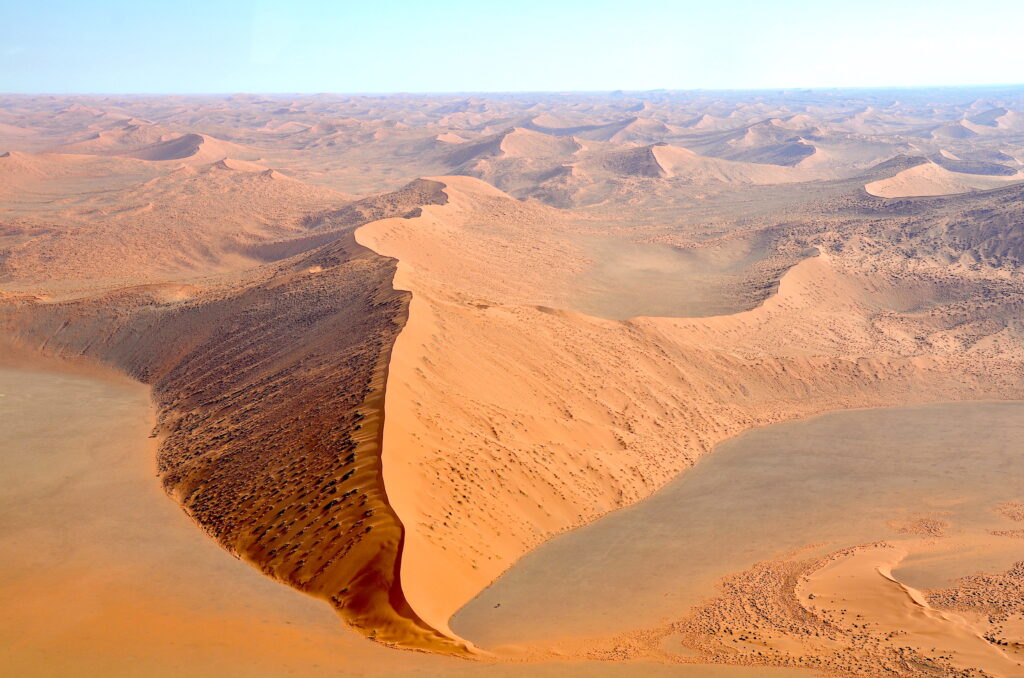 The Namib Sand Sea, part of the Namib Desert, features some of the highest and oldest sand dunes in the world, with some reaching over 300 meters (1,000 feet). This UNESCO World Heritage site is characterized by its dramatic red and orange sand dunes. Sossusvlei is a salt and clay pan surrounded by towering red sand dunes, located in the southern part of the Namib Desert within Namib-Naukluft National Park, Namibia. The dunes around Sossusvlei are some of the highest in the world, with some reaching heights of over 300 meters (984 feet). Dune 7 is a prominent sand dune located in the Namib Desert near the coastal town of Walvis Bay, Namibia. Standing at approximately 388 meters (1,273 feet), it is the tallest dune in the Namib Desert and one of the highest in the world. It is named “Dune 7” because it is the seventh dune beyond the Tsauchab River, a naming convention used by early settlers. The dune is a favorite spot for activities like sandboarding, quad biking, and hiking.